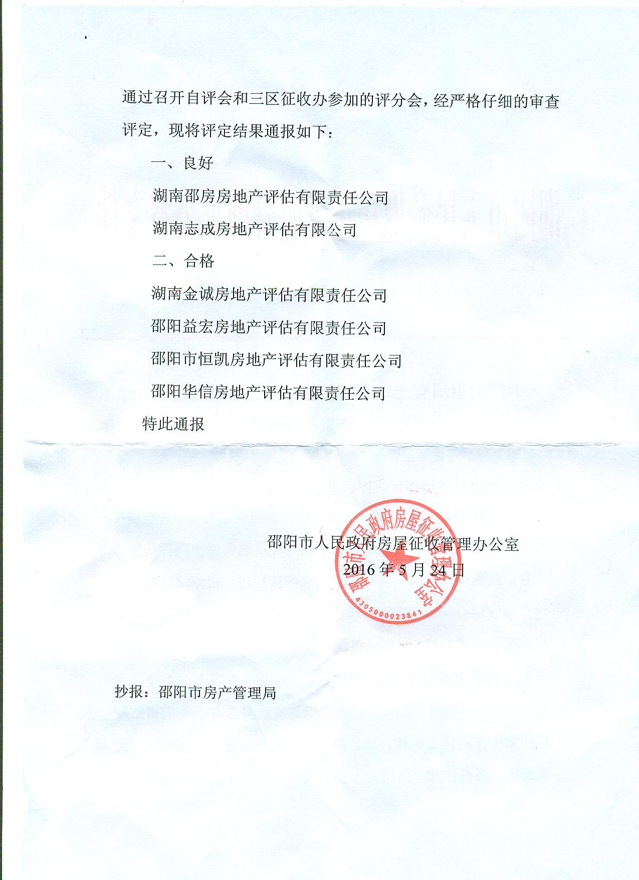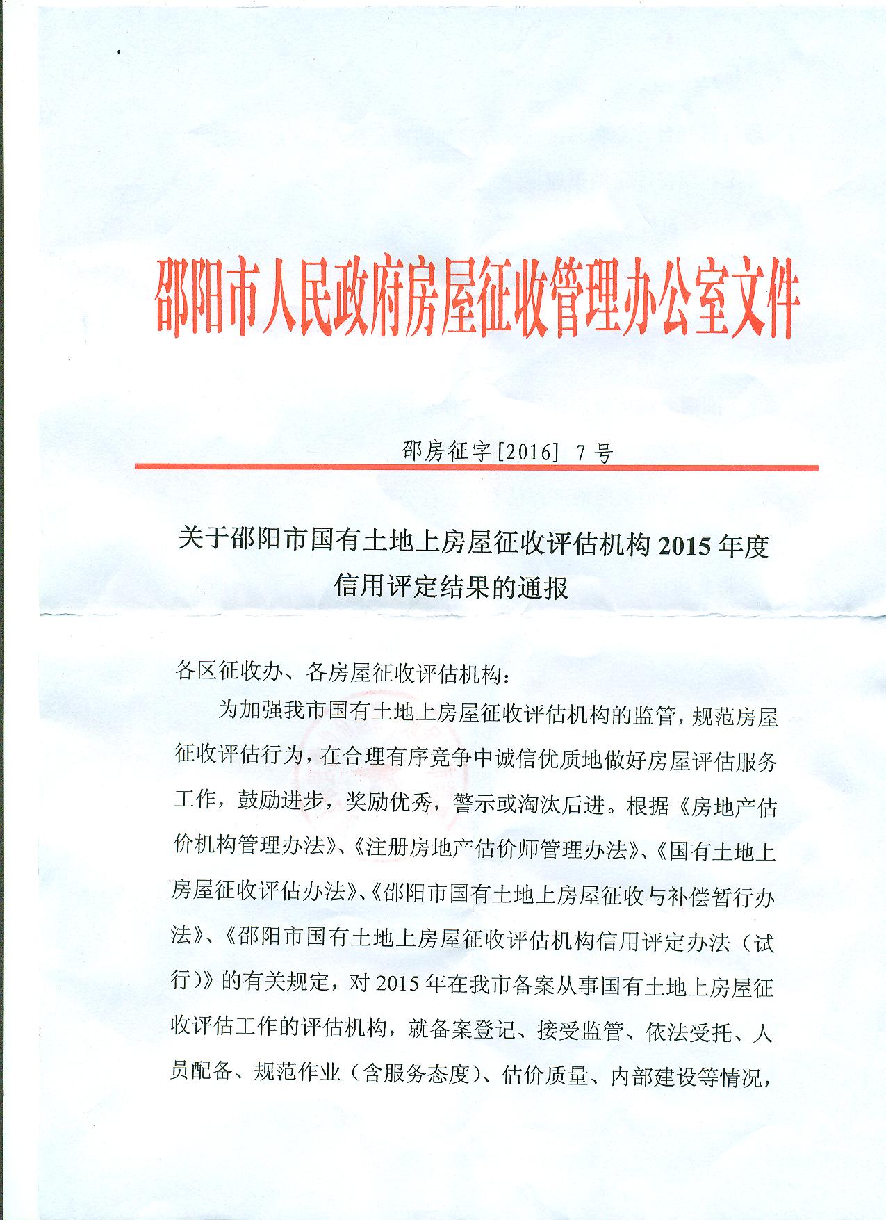 關(guān)于邵陽市國有土地上房屋征收評估機(jī)構(gòu)2015年信用評定結(jié)果的通報