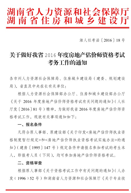 根據(jù)人力資源社會(huì)保障部辦公廳、住房和城鄉(xiāng)建設(shè)部辦公廳《關(guān)于2016年度房地產(chǎn)估價(jià)師資格考試有關(guān)問題的通知》(人社廳發(fā)〔2016〕81號(hào))精神,為做好我省2016年度房地產(chǎn)估價(jià)師資格考試工作,現(xiàn)就有關(guān)事項(xiàng)通知如下: